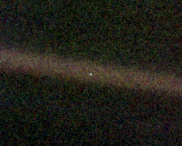 That is Earth seen from 4 billion miles away, photographed by Voyager 1 on June 6, 1990.