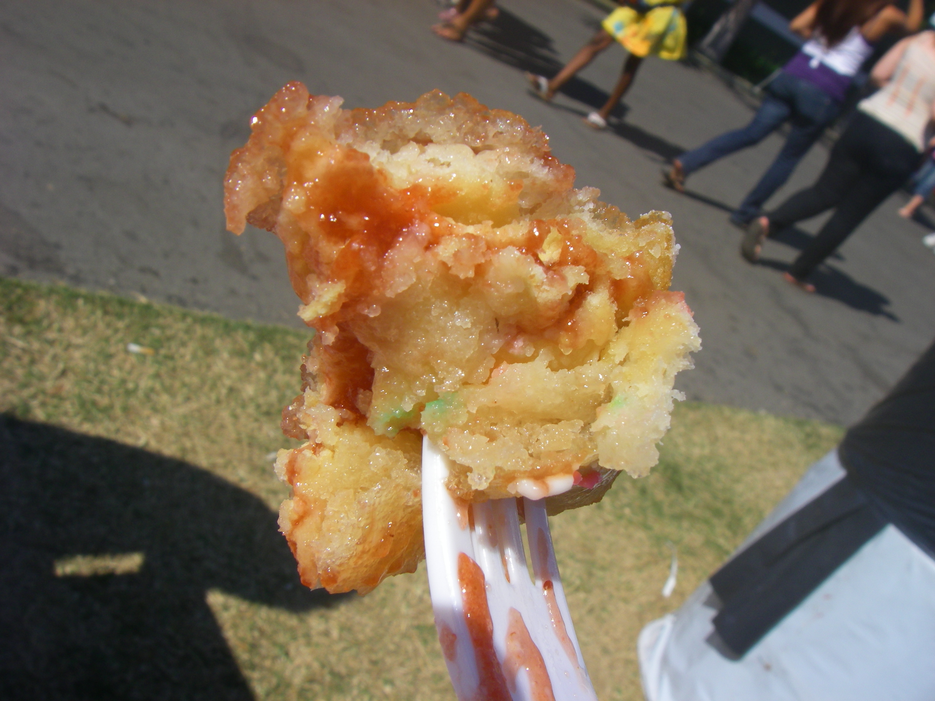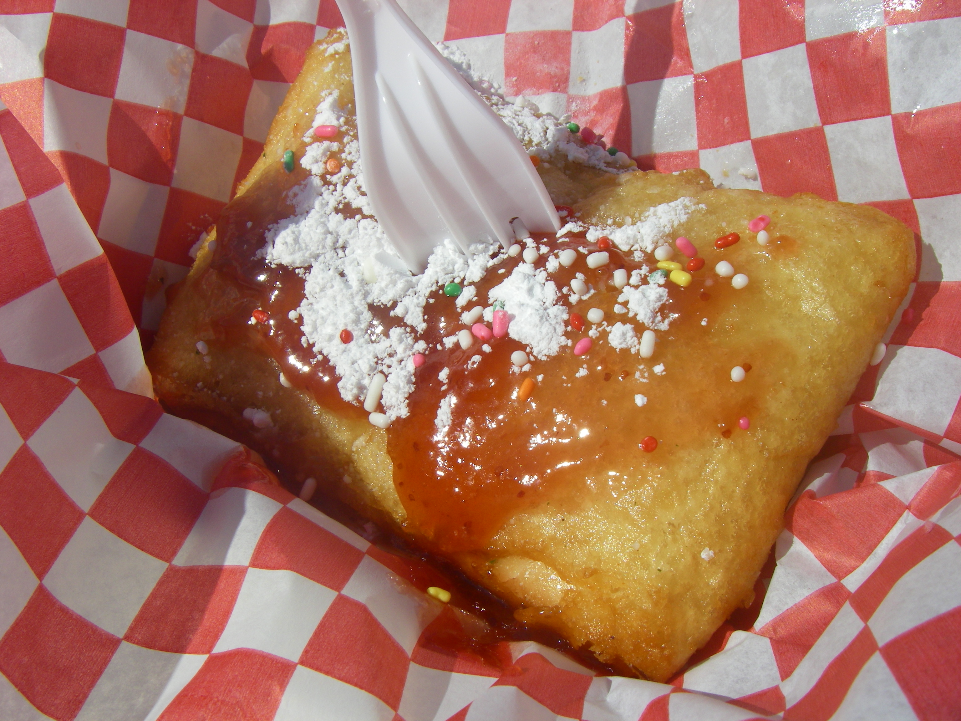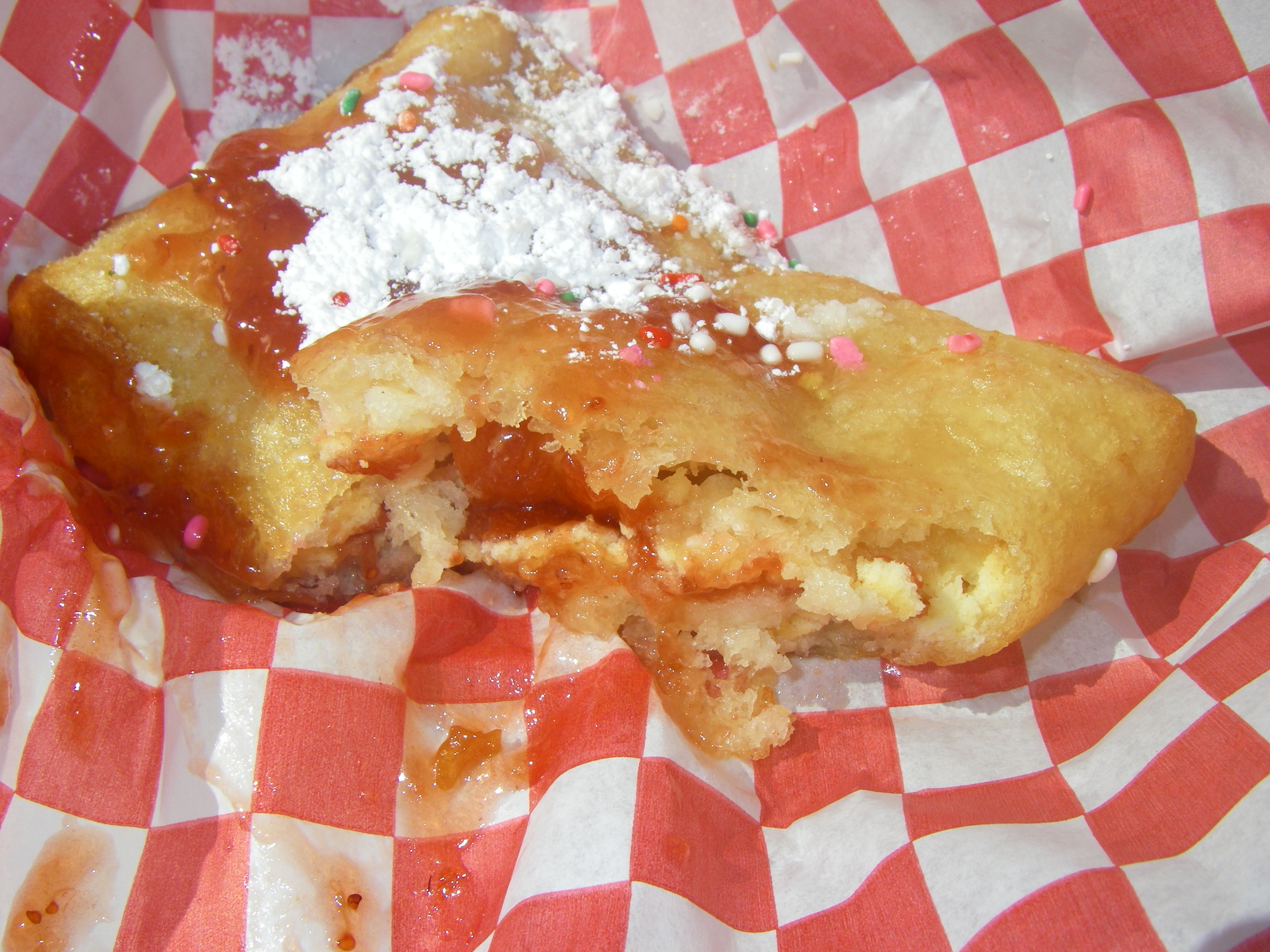 It amazes me how much stuff is on this thing. Think about it: crust, stuffed with strawberry filling, frosted and topped with rainbow sprinkles, battered, deep fried, topped with more jelly, sprinkles and powdered sugar.