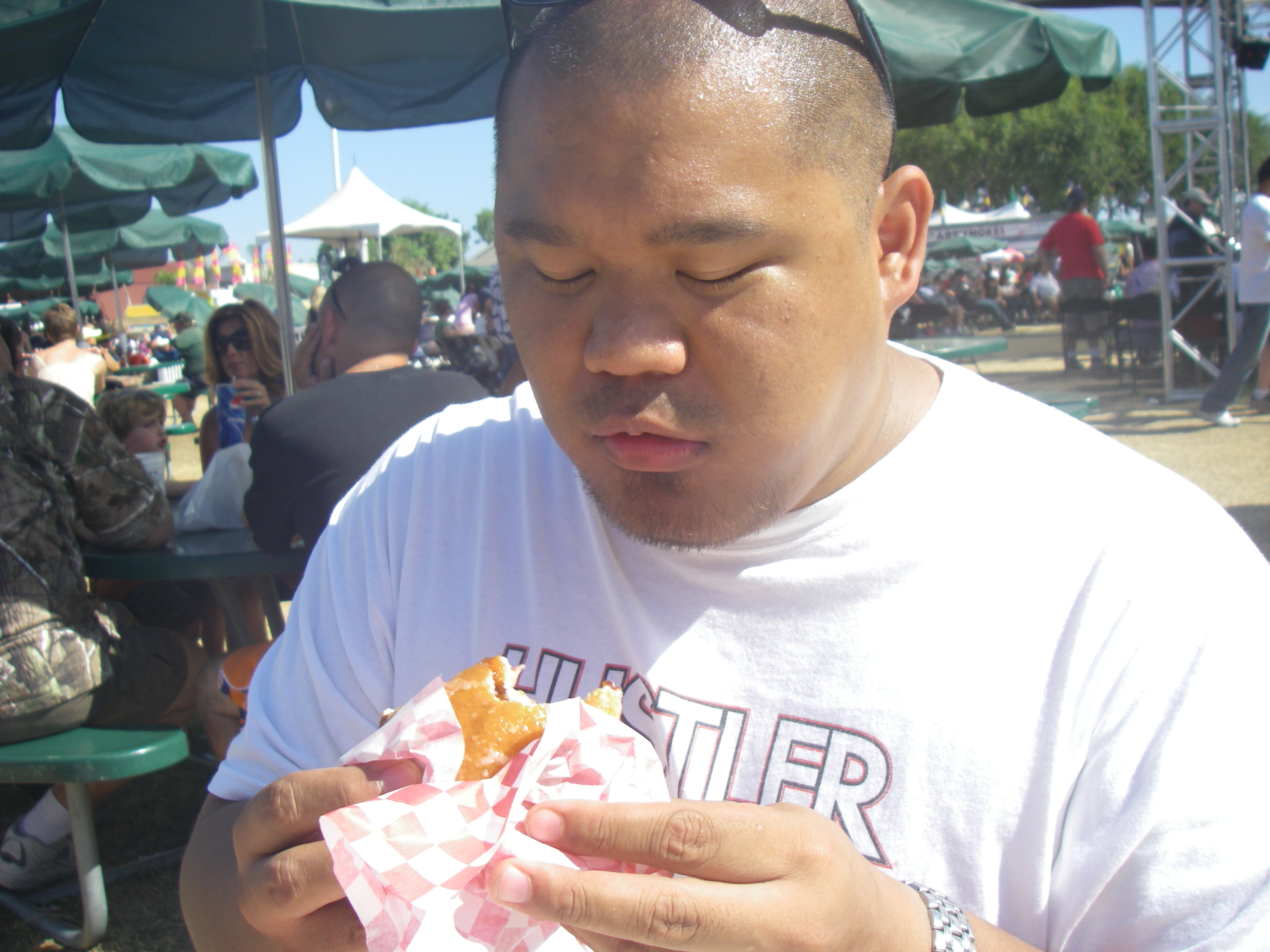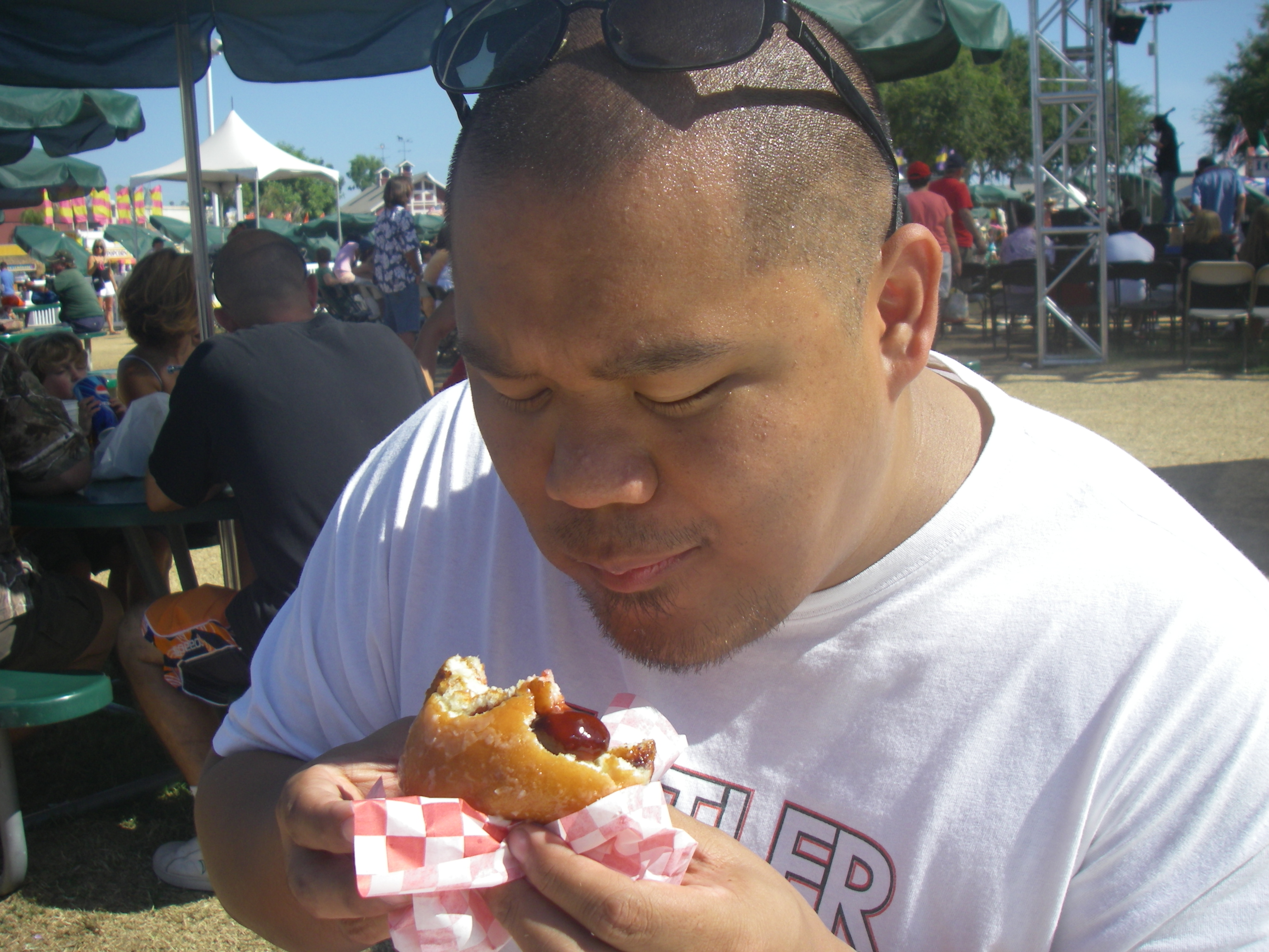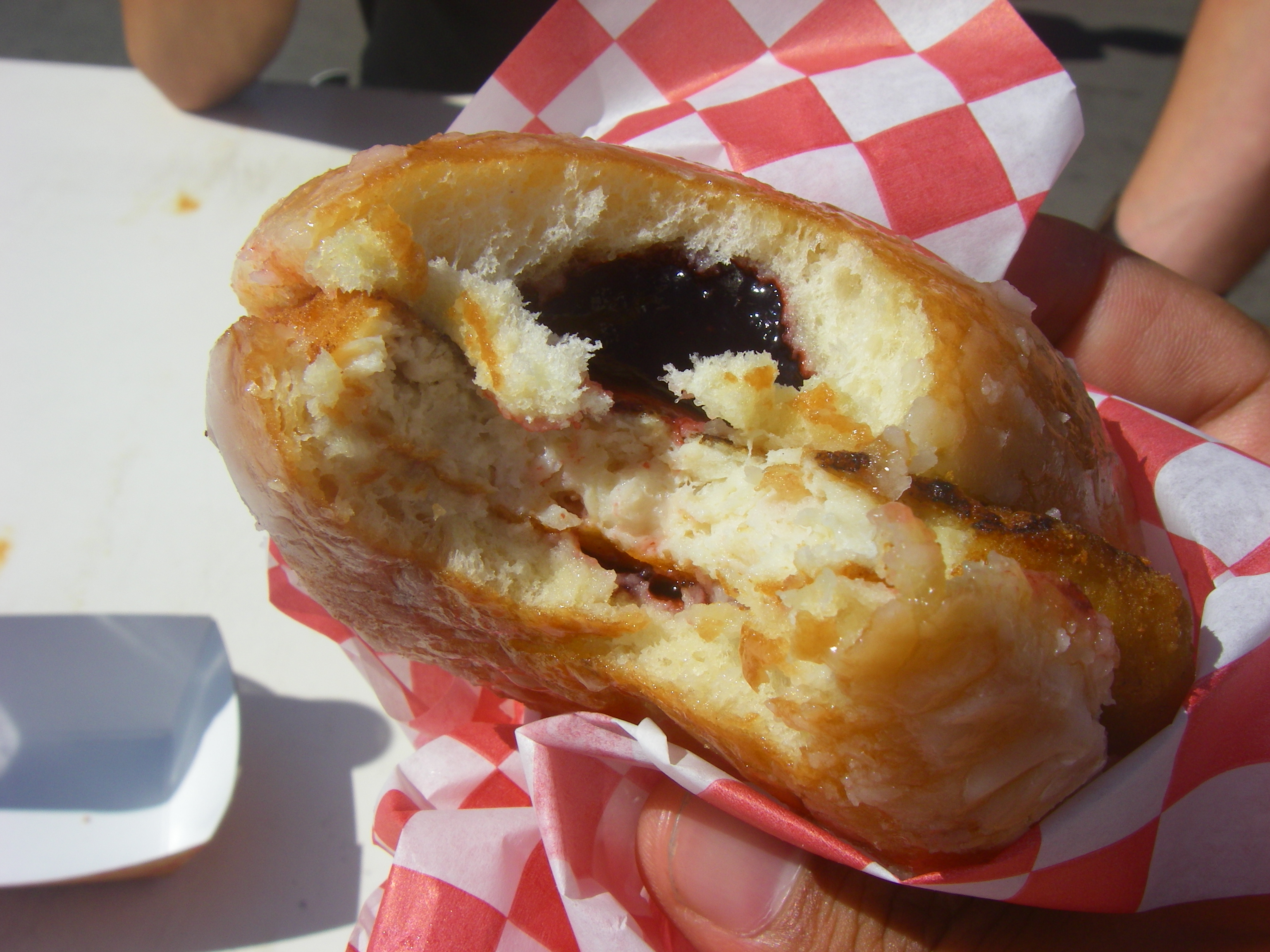 It amazes me how much stuff is on this thing. Think about it: crust, stuffed with strawberry filling, frosted and topped with rainbow sprinkles, battered, deep fried, topped with more jelly, sprinkles and powdered sugar.