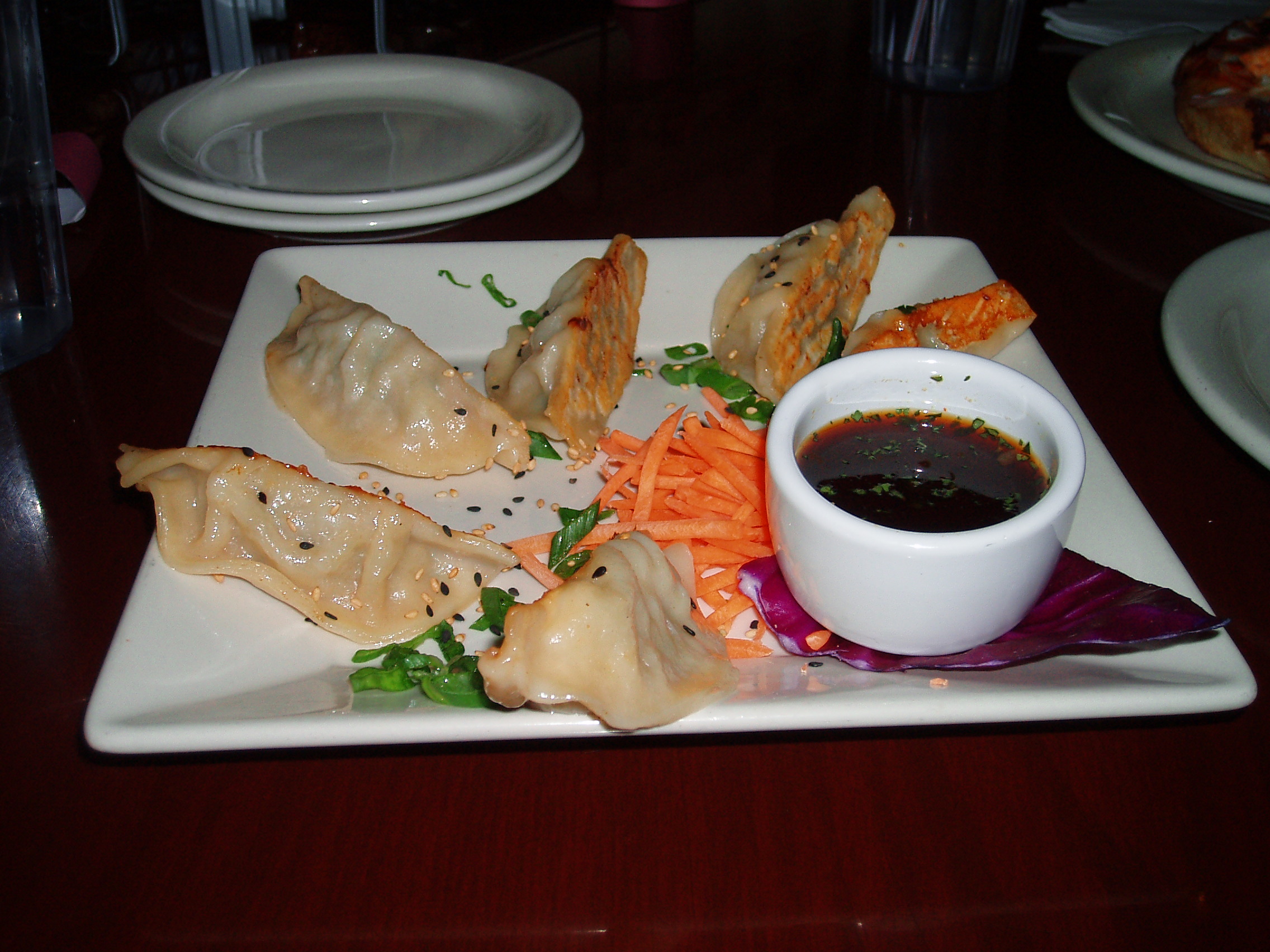 pan seared dumplings loaded with chicken green onions, Chinese yellow chives, ginger and garlic. Served with soy ginger sauce and garnished with green onions and sesame seeds