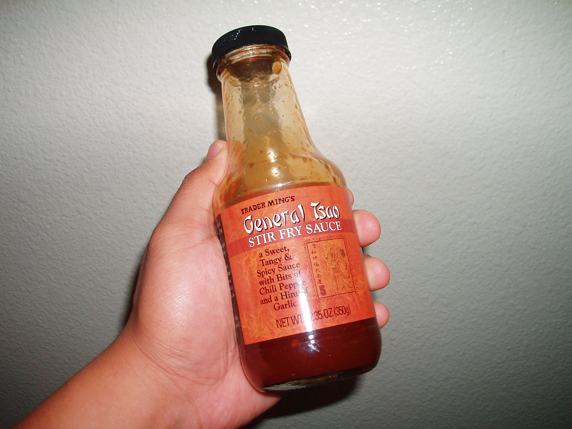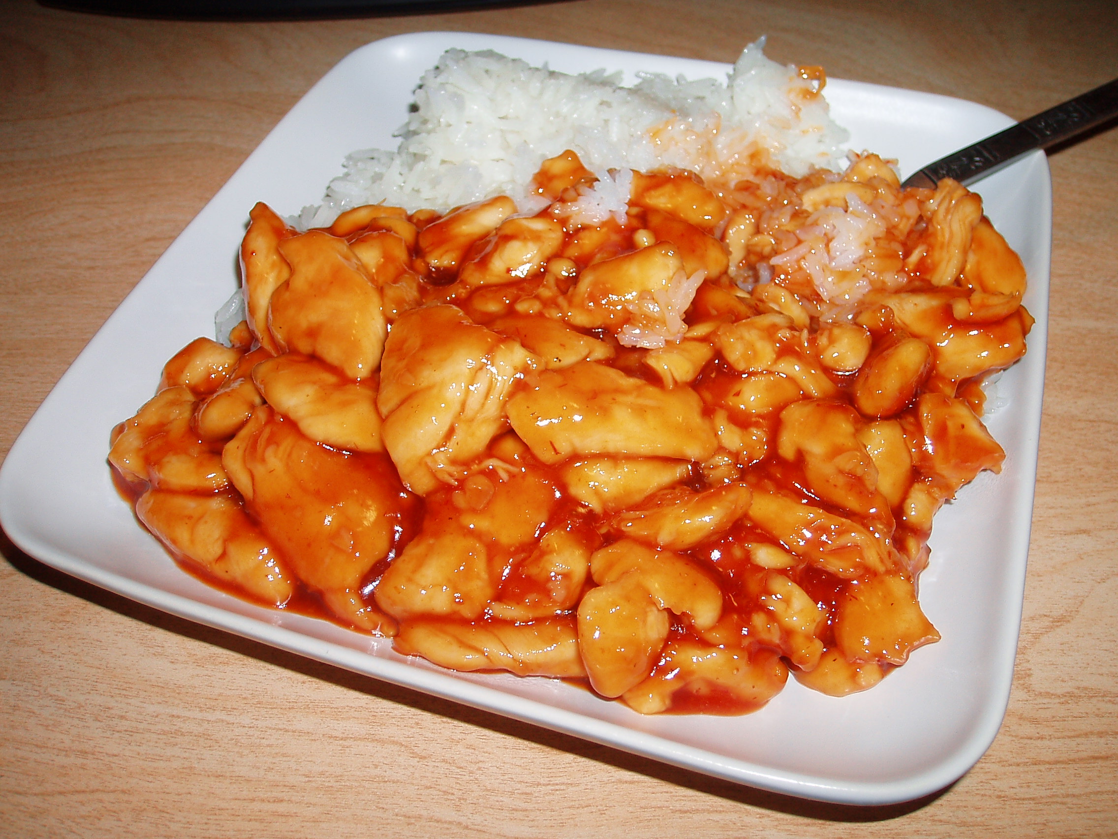 For the chicken I cut up bite-sized pieces of chicken breast, marinated it in corn starch, water and a little bit of soy sauce. Just stir-fried the chicken for a bit, added the sauce and let it simmer for a bit.